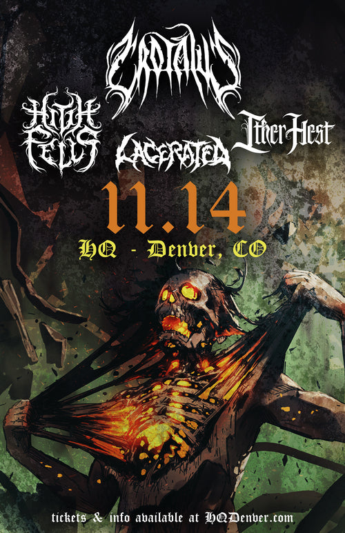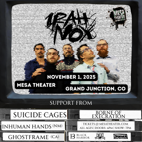 Promotional poster for a music event featuring 'Suicide Cages' and 'Irahnox' with a close-up of a woman's face.